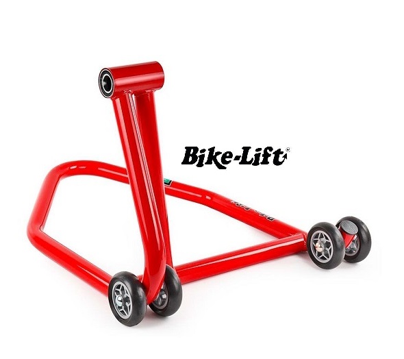 Este caballete elevador fabricado con tubo de acero de una sola pieza de Ø35 mm., pintado de rojo especial a base de polvo de poliéster, tiene como función principal apoyar y mantener la moto en posición perpendicular a la superficie de apoyo, elevando el tren trasero de las motocicletas que equipan basculante monobrazo, manteniendo la rueda despegada del suelo.