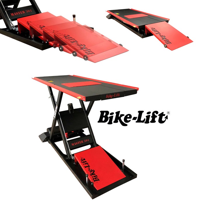 Elevador de moto MASTER 504. La mesa elevadora más polivalente de Bike-Lift con rampa retráctil automática. Disponible en versiones Electro-hidráulica y Neumática.