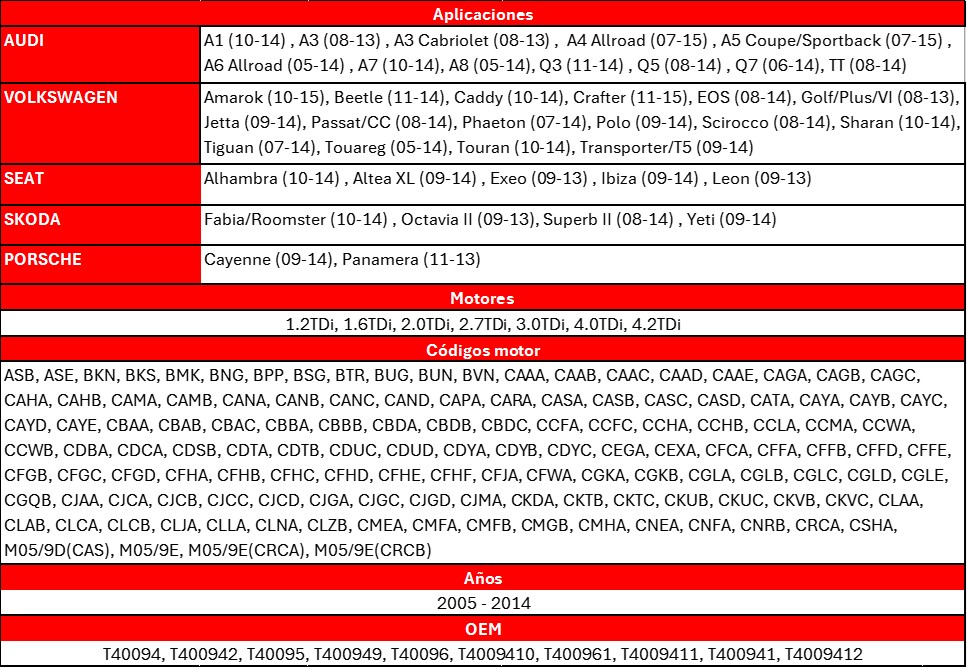 Este kit es compatible con motores TDi de Audi, Volkswagen, Seat, Skoda y Porsche (años 2005 – 2014) con los siguientes códigos de motor: