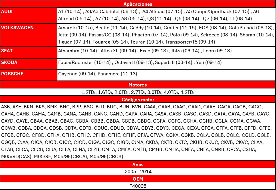 Compatibilidad total: diseñado específicamente para la extensísima gama de motores TDi (1.2, 1.6, 2.0, 2.7, 3.0, 4.0 y 4.2) de Audi, VW, Seat, Skoda y Porsche.
