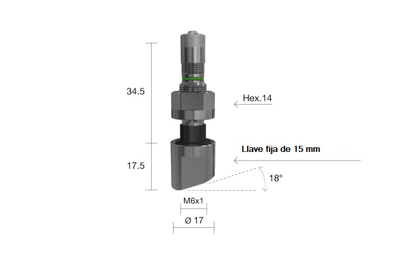 El diferencial de este modelo es su base angulada de 18º. Este ángulo compensa la inclinación del orificio en llantas de aluminio tipo ALCOA. De este modo, el sensor descansa de forma estable y segura. Al usar un vástago MS 40, se logra una configuración compacta. Esto protege el cuerpo del sensor contra las fuerzas centrífugas extremas y evita daños costosos.